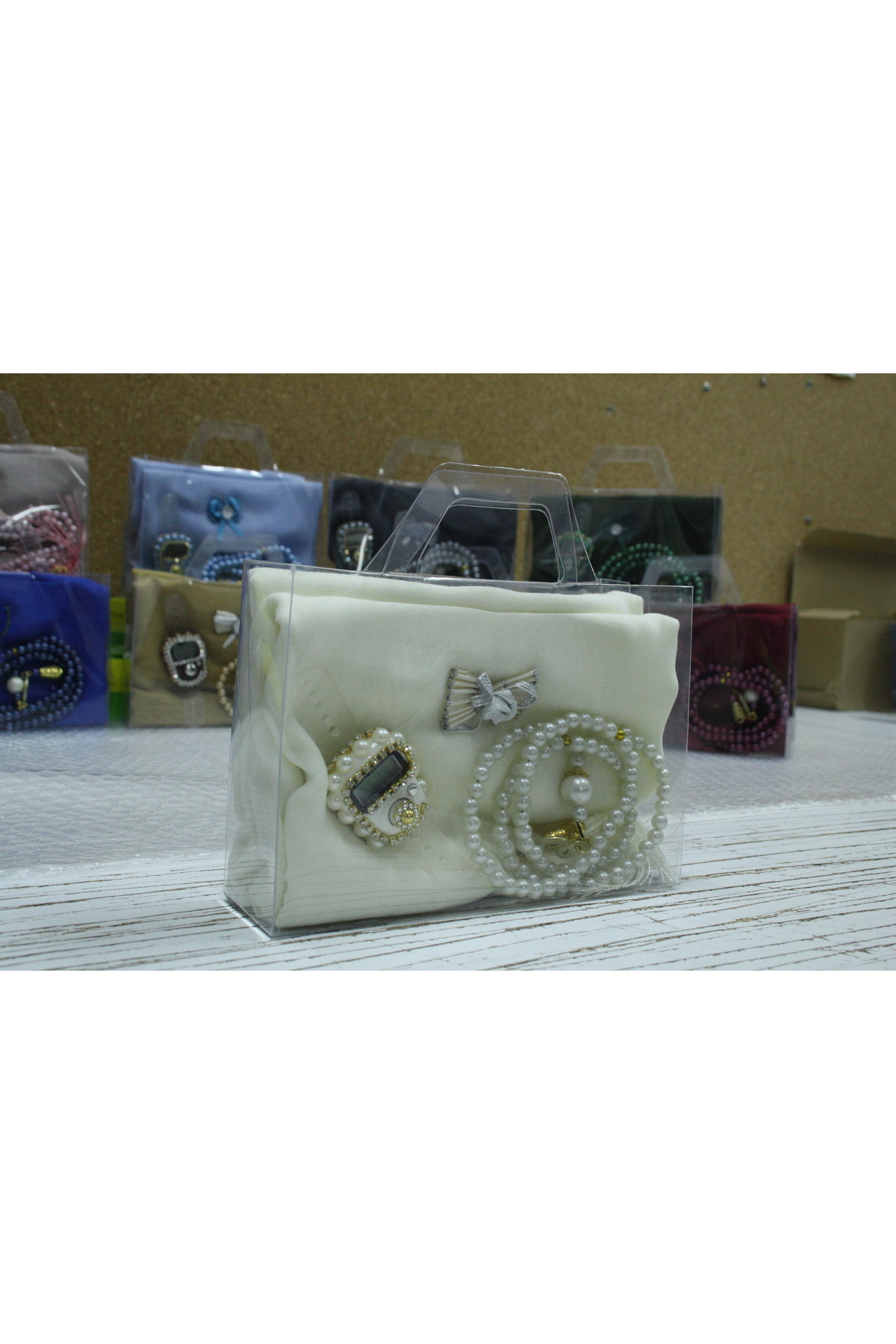 15 'li Başörtü Seti Taşlı Zikirmatik İnci Tesbih Çeyizlik Seti